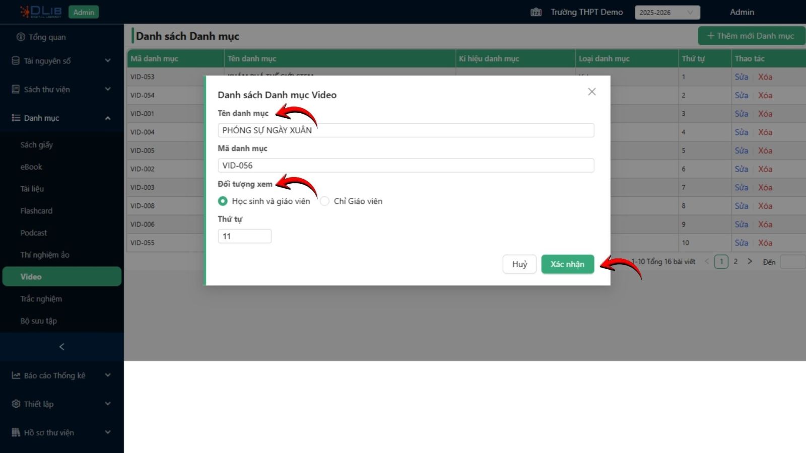 Tại đây, thực hiện nhập các thông tin gồm: Tên danh mục và Đối tượng xem. Sau khi hoàn tất, nhấn Xác nhận để tạo danh mục video.