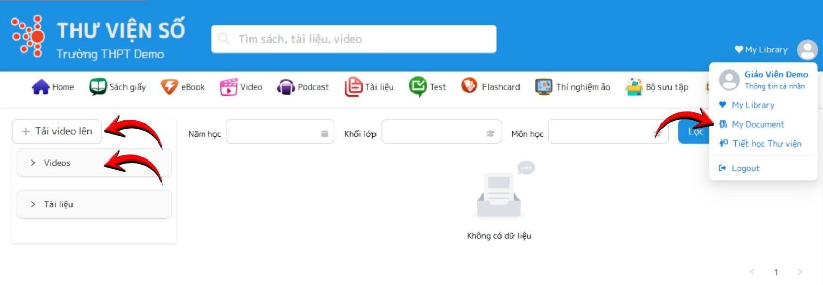 Giáo viên đăng nhập vào Thư viện số bằng tài khoản cá nhân, chọn ảnh đại diện ở góc phải màn hình sau đó nhấn vào My Document. Trước khi tải video, cần chọn đúng danh mục Video đã tạo.