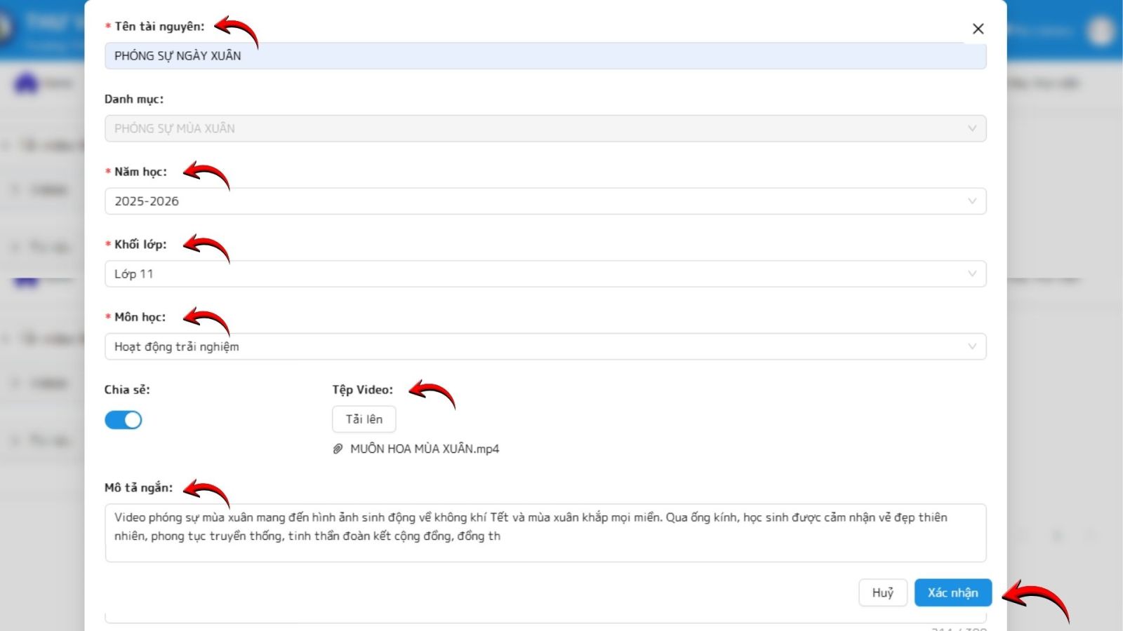 Sau khi hoàn tất thao tác, giáo viên có thể quay lại giao diện quản lý để kiểm tra. Hệ thống sẽ hiển thị tổng số video hiện có, giáo viên có thể tiếp tục thêm nhiều video con khác tùy theo nhu cầu giảng dạy.